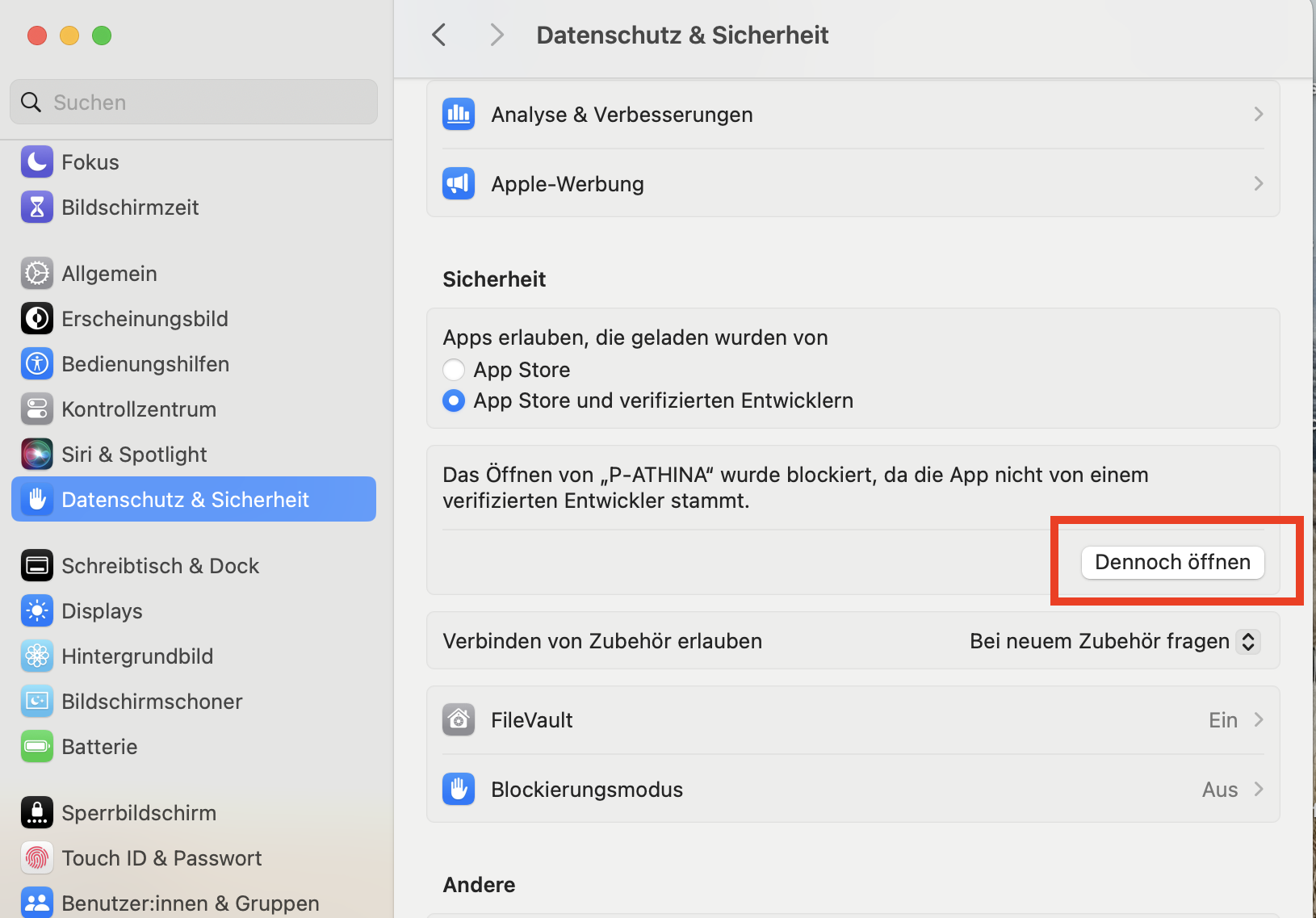 Ein Hinweis für macOS-Nutzer: Nachdem P-ATHINA heruntergeladen und zum ersten Mal geöffnet wird, wird die Anwendung aus Sicherheitsgründen blockiert. Daher müssen die Einstellungen auf dem MacBook unter „Datenschutz & Sicherheit“ folgendermaßen angepasst werden: